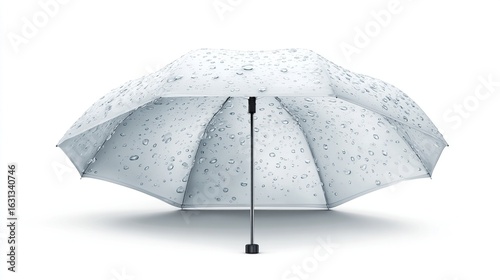 Opened, light-colored umbrella covered in droplets on a white background, soft shadow