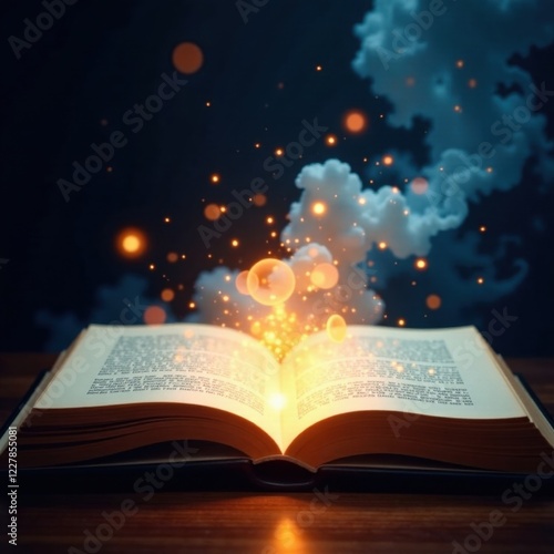 Opened magic book with glowing pages and soft light, magic, page