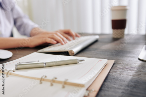 Opened planner and pen on desk of female entrepreneur busy with work, selective focus