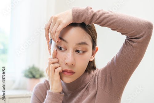 Ophthalmology care, eye sight, vision concept. Asian young woman, female hand holding and putting, wearing soft contact lenses with finger on face, girl looking in mirror at home, beauty and health.