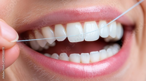 Oral care gum protection essential. Smiling person flossing teeth for dental hygiene and care.