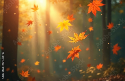 Orange and yellow maple leaves fall gently through sunlit forest beams. Warm light shines on falling leaves in woodland path. Autumn season nature scene with soft focus.