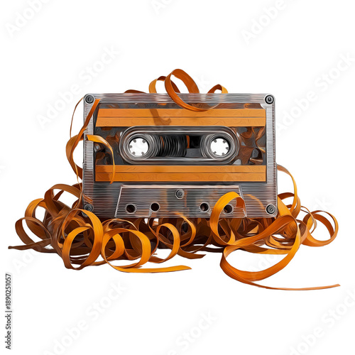 Orange Cassette Tape with Unwound Magnetic Tape graphic isolated on a transparent background