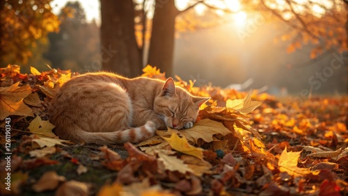 Orange cat sleeping on colorful autumn leaves