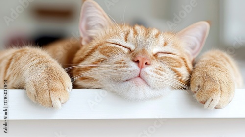 Orange cat sleeping peacefully on white shelf