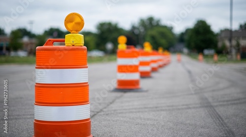 Orange construction barrels with reflective stripes and yellow flashing lights are lined up on an asphalt road under a cloudy sky directing traffic traffic barrel safety barrel