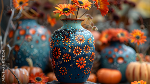 Orange Flowers in Blue Vase with Pumpkins Illustration