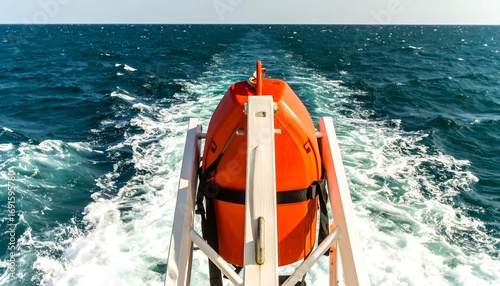 Orange life raft on ship stern
