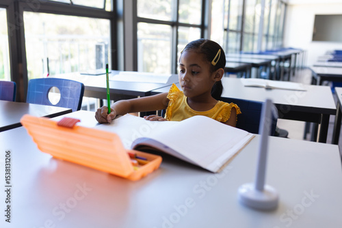 Orange pencil case lying open on desk with notebook and gray stand in classroom, copy space
