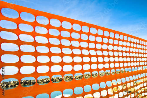 Orange plastic grid around a construction site on the coastline