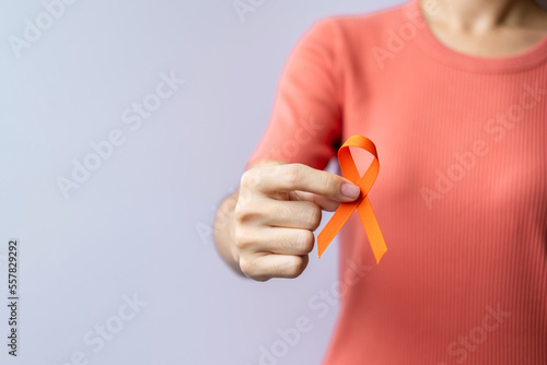 Orange Ribbon for Leukemia, Kidney cancer day, world Multiple Sclerosis, CRPS, Self Injury Awareness month. Healthcare and word cancer day concept