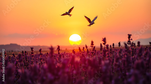 Orange sun sets behind a silhouetted tree, as a flock of birds flies in a colorful sky over a grassy field
