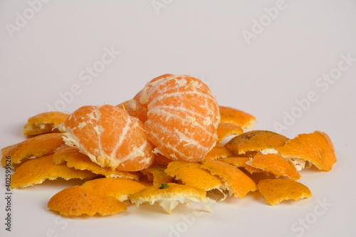 Orange tangerine shells, slices close-up isolated on white background