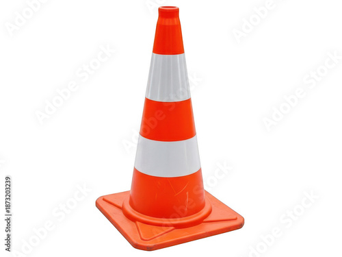 Orange traffic cone with white stripes isolated on transparent background