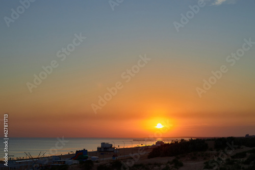 Orange-gold sunset, sky, sunlight, summer mood landscape with sea sunset on beach.