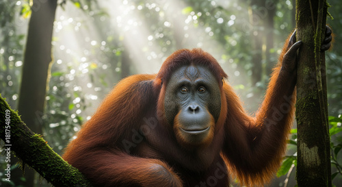 Orangutan in Rainforest A Portrait of Wildlife in the Sunlight Amidst Lush Greenery and Foliage
