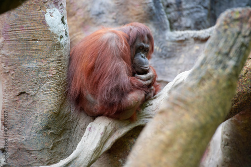 Orangutan sitting protecting himself between logs
