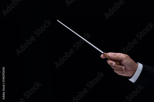 Orchestra conductor hands baton. Hands of conductor holding stick on a black background
