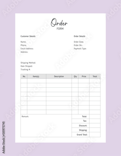 Order Form planner. Minimalist planner template set. Vector illustration.