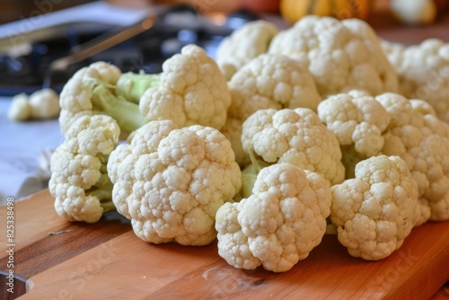Organic cauliflower florets prepared for cooking on a kitchen table