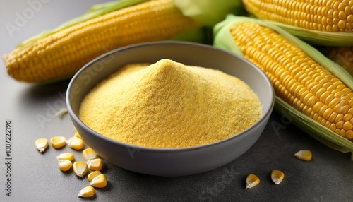 organic cornmeal in gray bowl with fresh corn cobs on gray background close up