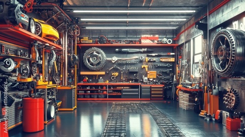Organized Auto Mechanic's Workshop with Shelves, Tools, and Equipment