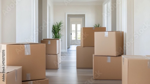 Organized cardboard boxes stacked neatly in a minimalistic home hallway during a moving or relocation process The interior design features a clean tidy and uncluttered aesthetic