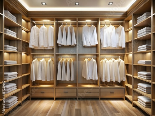 Organized closet interior with rows of crisp white shirts on wooden shelves, surrounded by empty space, and illuminated by soft, natural light.