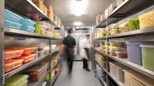 Organized Commercial Kitchen Storage with Fresh Ingredients and Staff