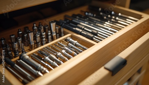 Organized drawer filled with various metal tools and sockets.