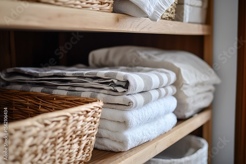Organized Linen Closet with Folded Towels and Wicker Baskets on Light Wood Shelves