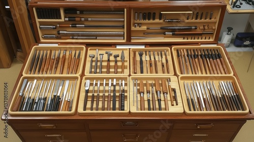 Organized wooden tool chest filled with various tools, arranged in compartments.