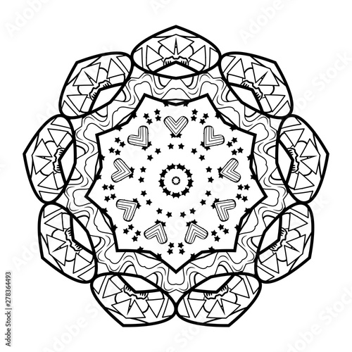 Oriental kaleidoscope black and white. Pattern coloring for adults. Hand drawn illustration. - Vector