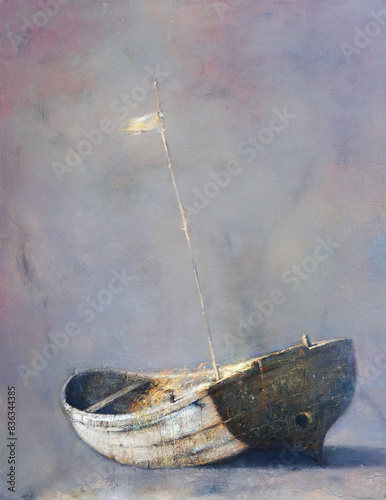 Original oil painting on canvas of the wooden sailing boat with white flaf