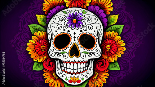 Ornamental Calavera of Día de los Muertos: A Festive Sugar Skull Adorned with Bright Flowers and Heart-Shaped Nasal Cavity, Celebrating Life and Death with Intricate Petal Patterns and a Purple Textur