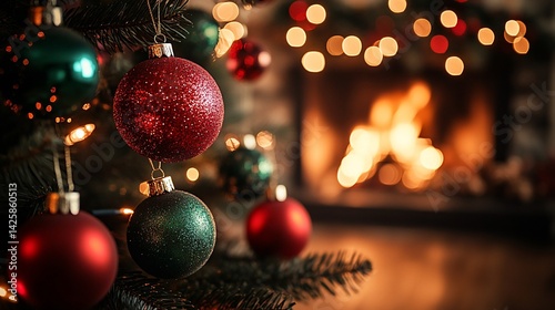 Ornaments hang on tree, lit by fireplace at home during Christmas season