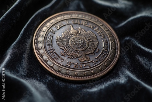 Ornate bronze coin, dark fabric background.