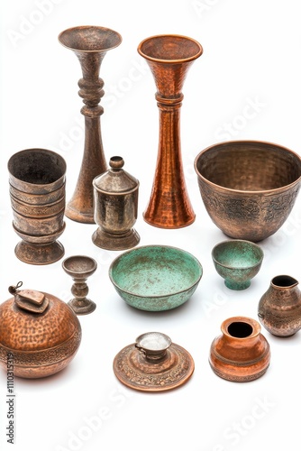 Ornate copper vessels, bowls, and small containers.