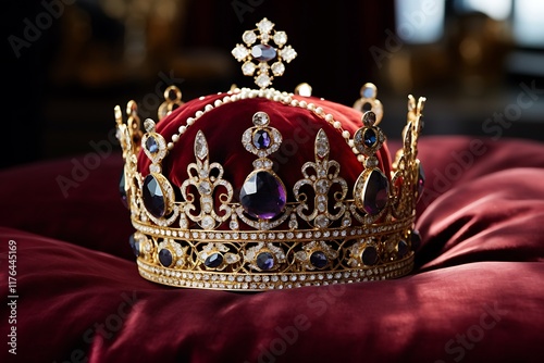 Ornate crown adorned with jewels resting on a plush cushion.