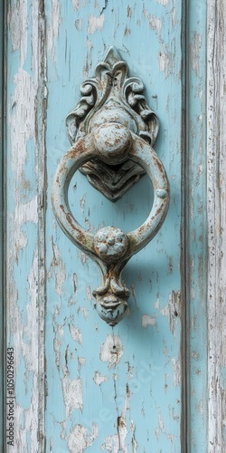 Ornate Door Knocker on Weathered Blue Door