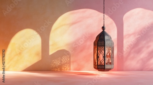 Ornate Metal Lantern Hanging in Room with Arch Shadows