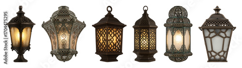 Ornate metal lantern set including six different vintage, antique, and decorative styles isolated. Architectural lighting and home decor elements.