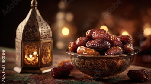 Ornate Moroccan lantern illuminates a decorative bowl filled with fresh dates, set on a rustic wooden surface with soft, glowing bokeh.