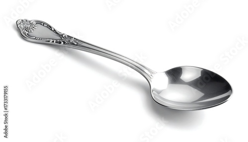 Ornate silver spoon, polished, rests on white