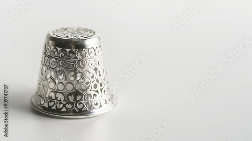 Ornate silver thimble with intricate patterns, needlework accessory on white, sewing tool concept