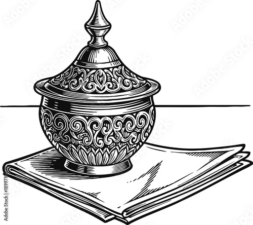 Ornate vintage container with lid on folded cloth decorative traditional vessel illustration