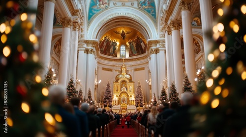 Orthodox church interior with a large congregation celebrating Christmas, children in traditional attire, and festive decor all around