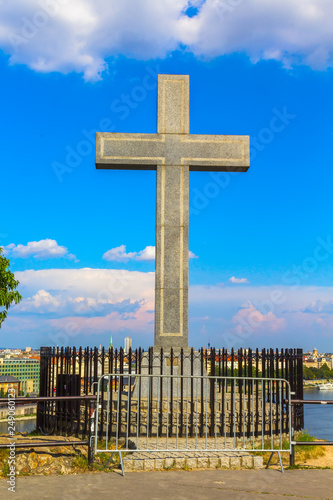 Orthodox stone cross on a high hill