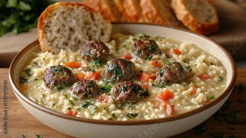 Orzo soup with meatballs and bread. Warm and inviting dish on wooden board