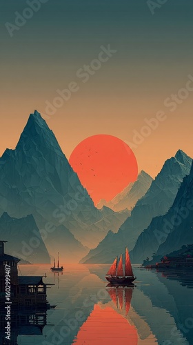 Otherworldly Sunset Landscape Featuring Dramatic Geometric Mountains and Tranquil Boats